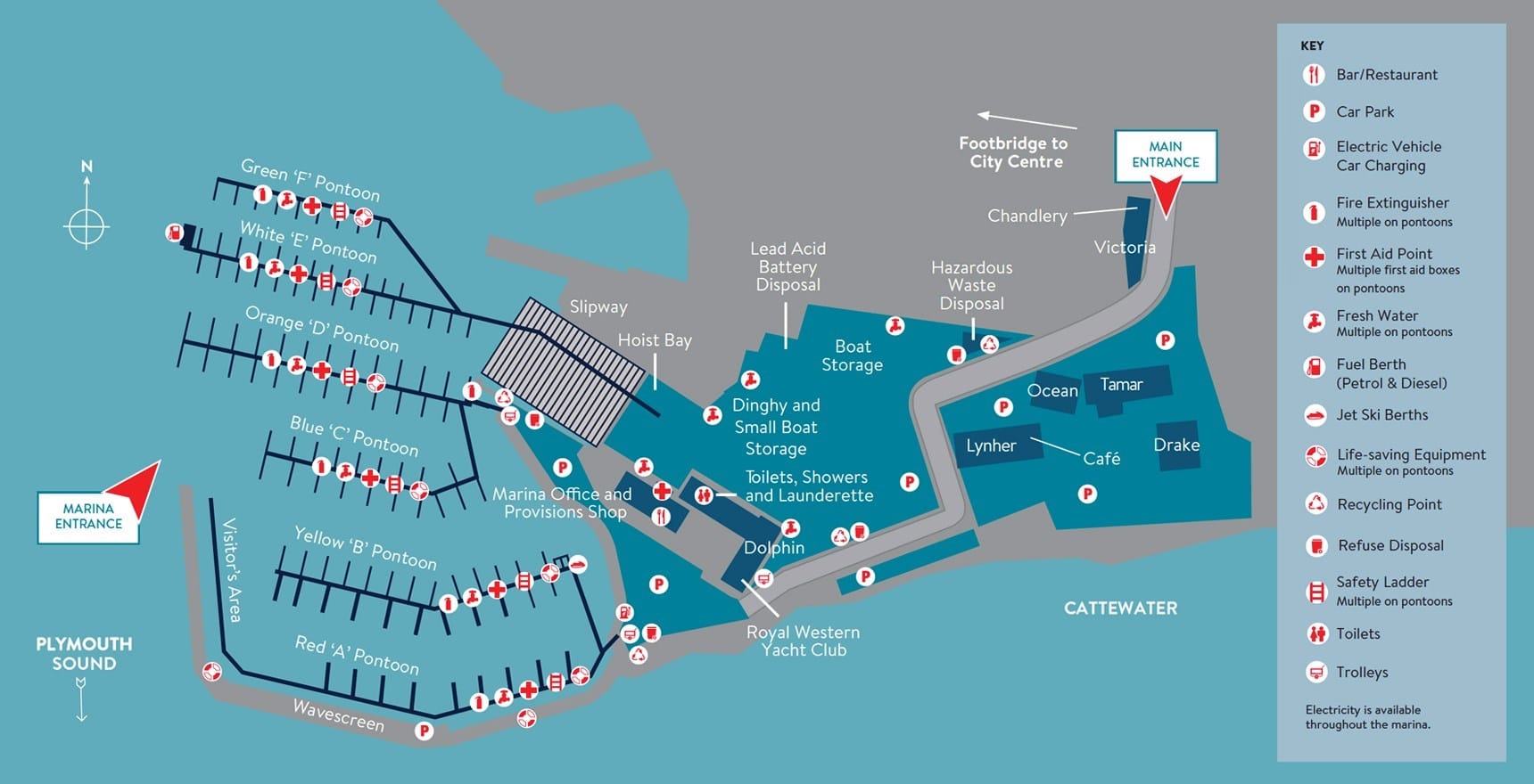 Queen Anne’s Battery Marina, Plymouth PL4 0LP. Telephone 01752 671142. Access Gate for Red “A” & Yellow “B” Pontoons. The Access Gate is opposite the Marina Office building and Royal Western Yacht Club. Please see below for Directions and a Marina Map.